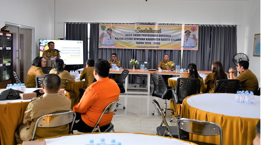 MMCKalteng - Buntok - Asisten Administrasi Umum Sekretariat Daerah (Setda) Kabupaten Barito Selatan (Barsel) Eko Hermansyah membuka secara resmi acara Sosialisasi Penyusunan Dokumen Kajian Risiko Bencana (KRB) Kabupaten Barito Selatan Tahun 2026-2030 di Lingkungan Pemerintah Kabupaten Barito Selatan yang digelar di Aula BPBD Kabupaten Barsel, Senin (22/12/2025).